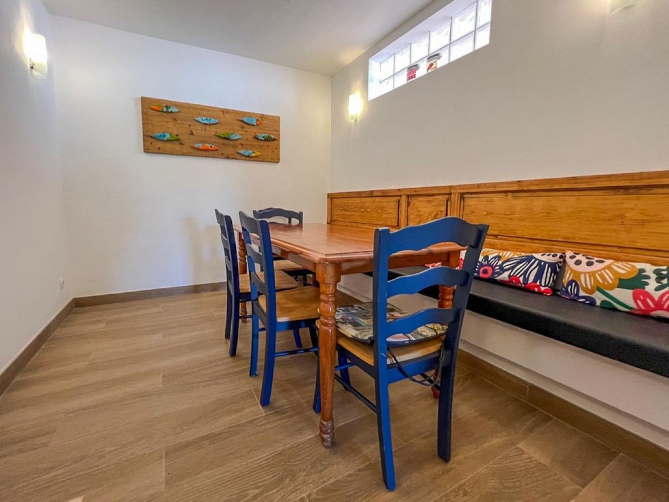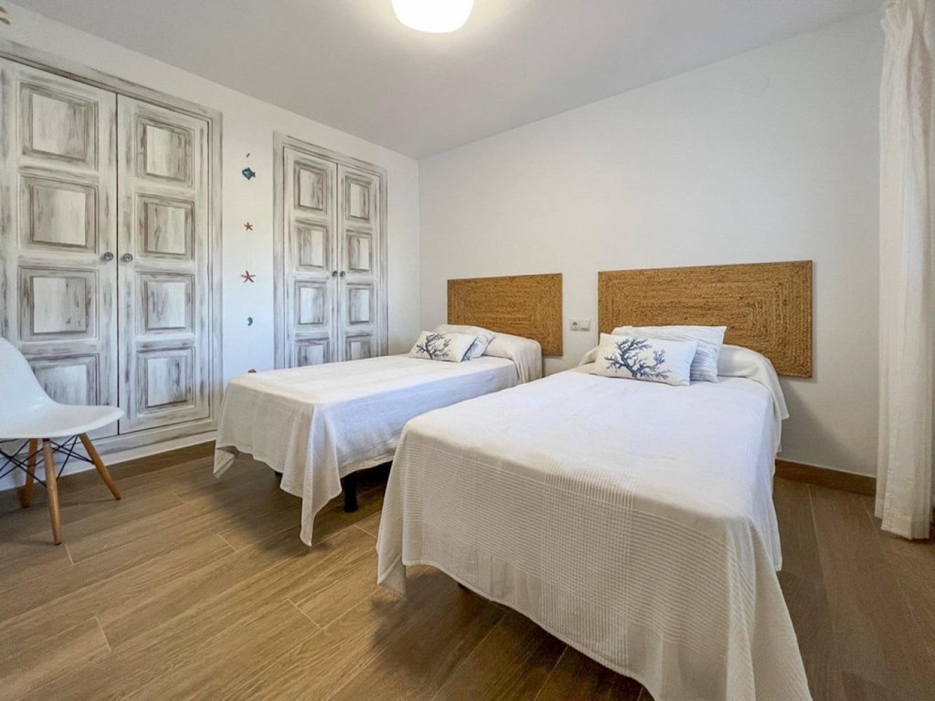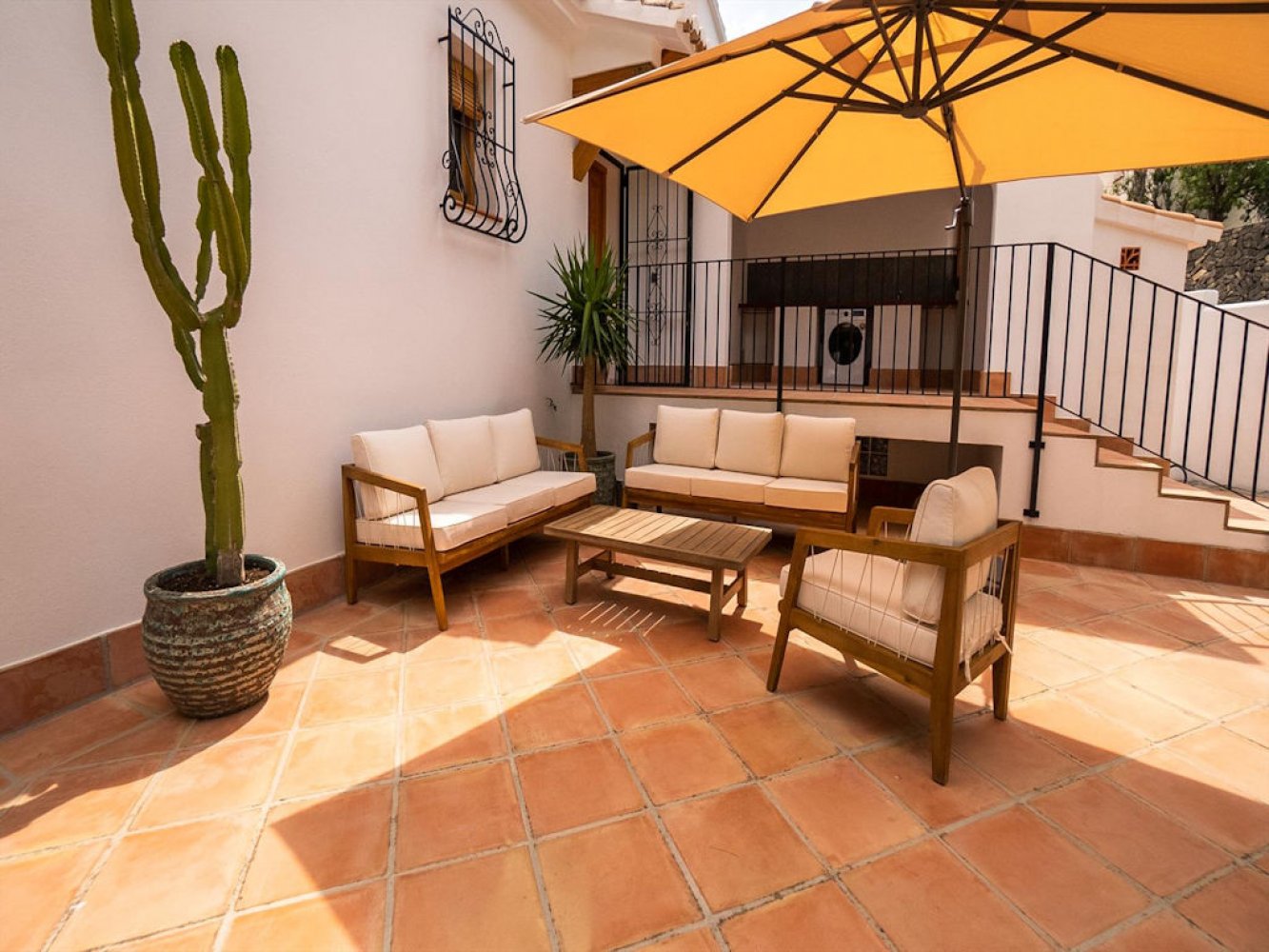 Der Bungalow hat 2 Etagen und verfügt über ein helles Wohn- und Esszimmer mit Kamin und TV, eine komplett ausgestattete Küche, einen Abstellraum mit Waschmaschine und Trockner, vier Doppelschlafzimmer (zwei davon klimatisiert) sowie zwei moderne Bäder. Vom Wohnbereich aus gelangen Sie auf eine schöne überdachte Terrasse und eine große Sonnenterrasse. Vom Balkon in der oberen Etage genießen Sie einen atemberaubenden Blick über die Ferienanlage und die mediterrane Landschaft von Moraira.