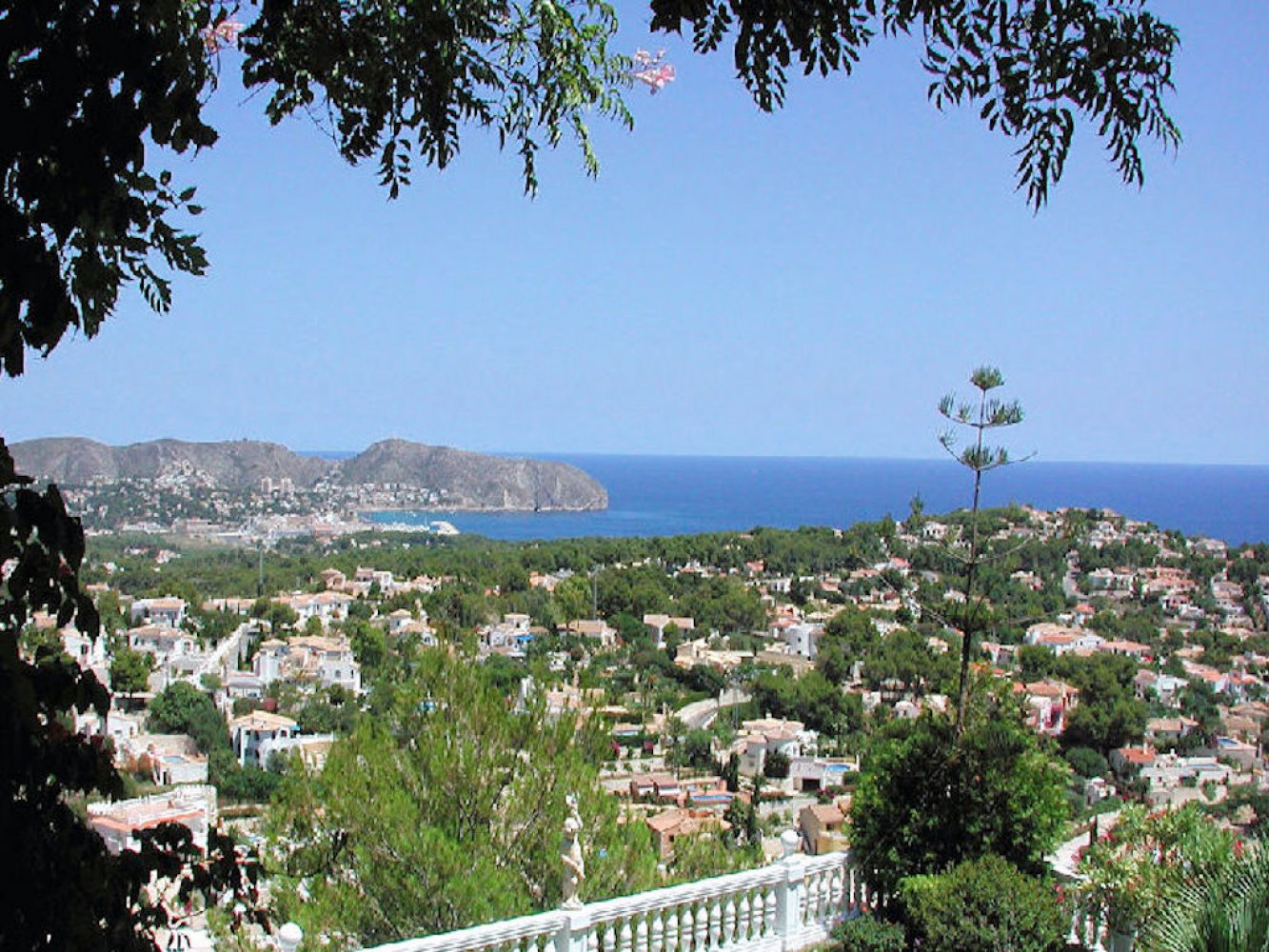 Modernes Ferienhaus in Moraira mit fantastischem Panoramablick auf die umliegende mediterrane Landschaft. Das Haus ist Teil einer gepflegten Ferienanlage und bietet Zugang zu einer Liegewiese mit Gemeinschaftsschwimmbad und Kinderbecken.