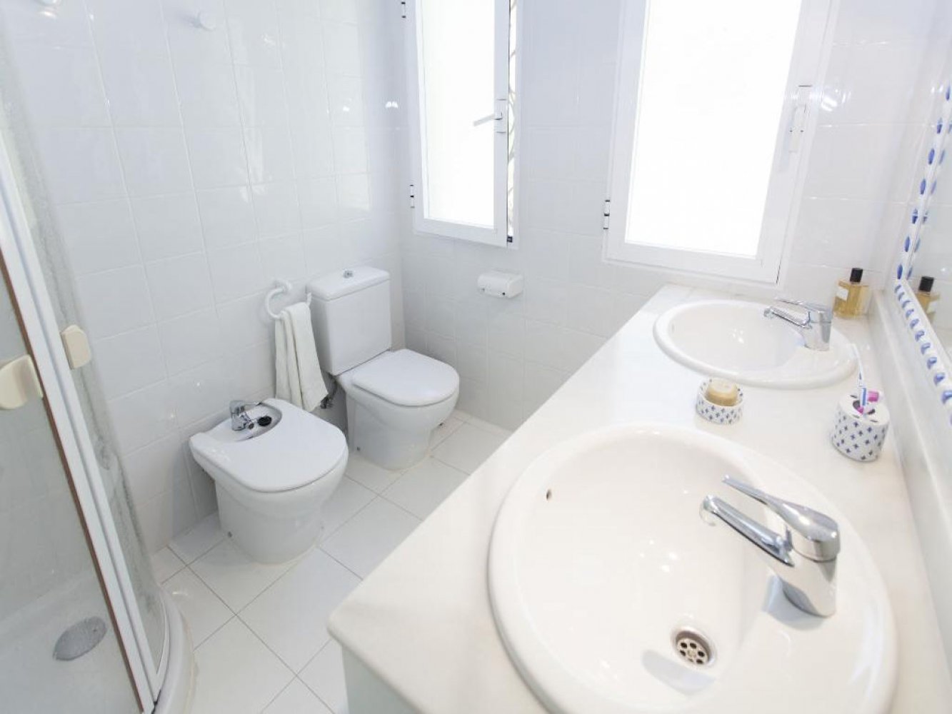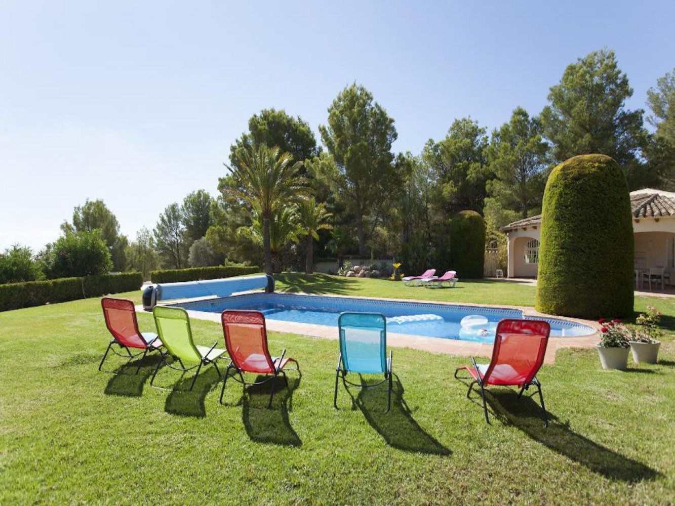 Das Ferienhaus erstreckt sich über zwei Etagen und verfügt über ein lichtdurchflutetes Wohn- und Esszimmer mit Kamin und Sat-TV, eine moderne, komplett ausgestattete Küche mit Geschirrspüler sowie einen Hauswirtschaftsraum mit Waschmaschine. Zudem bietet das Haus drei Doppelschlafzimmer und drei moderne Bäder. Vom Wohn- und Essbereich gelangen Sie auf eine schöne, überdachte Terrasse und in den Poolbereich.