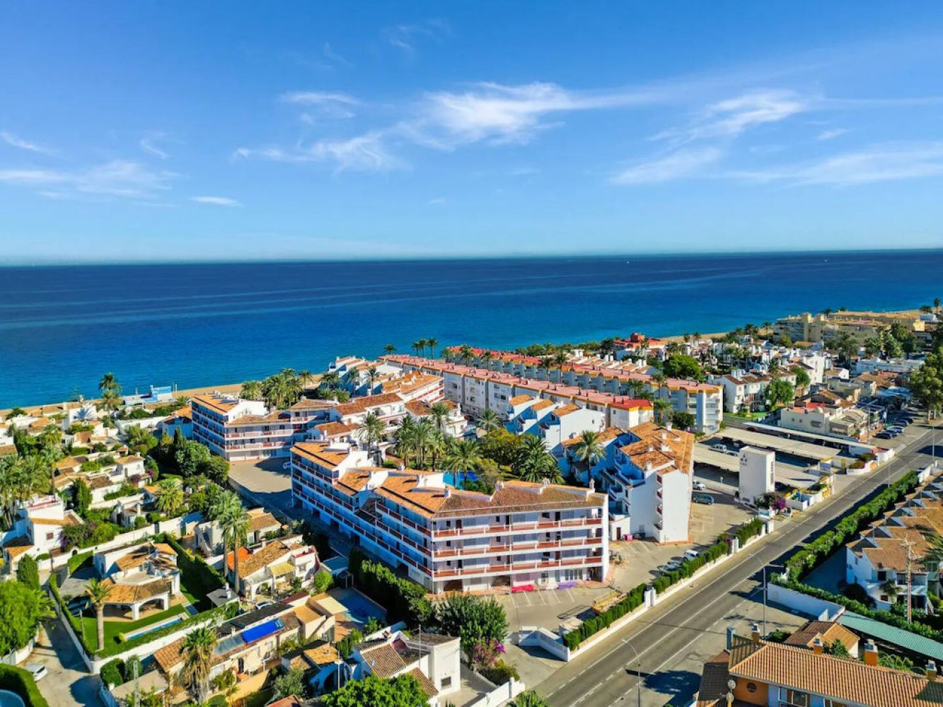 Moderne, strandnahe Ferienwohnung an der Costa Blanca bei Dénia mit Panoramablick auf das Mittelmeer. Das Apartment liegt nur 100 Meter vom Sandstrand entfernt und hat Anschluss an eine gepflegte Ferienanlage mit tropischem Gemeinschaftsgarten sowie einer großzügigen Schwimmbadlandschaft mit Kinderbecken.