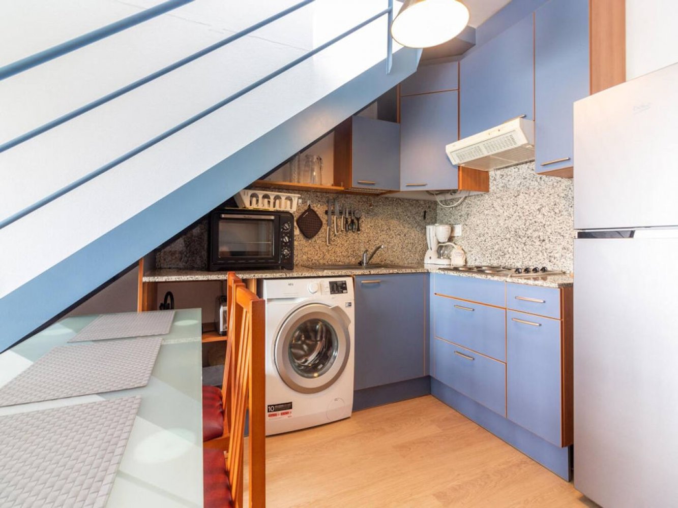 Wohn/Esszimmer, voll ausgestattete Küche(en), Herd, Kühlschrank, Gefrierfach, Toaster, Kaffeemaschine, Mikrowelle, Bügeleisen, Reinigungsset, Geschirr usw.