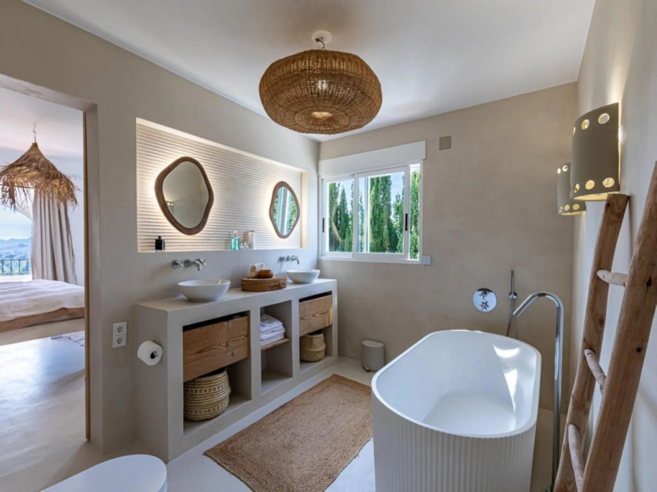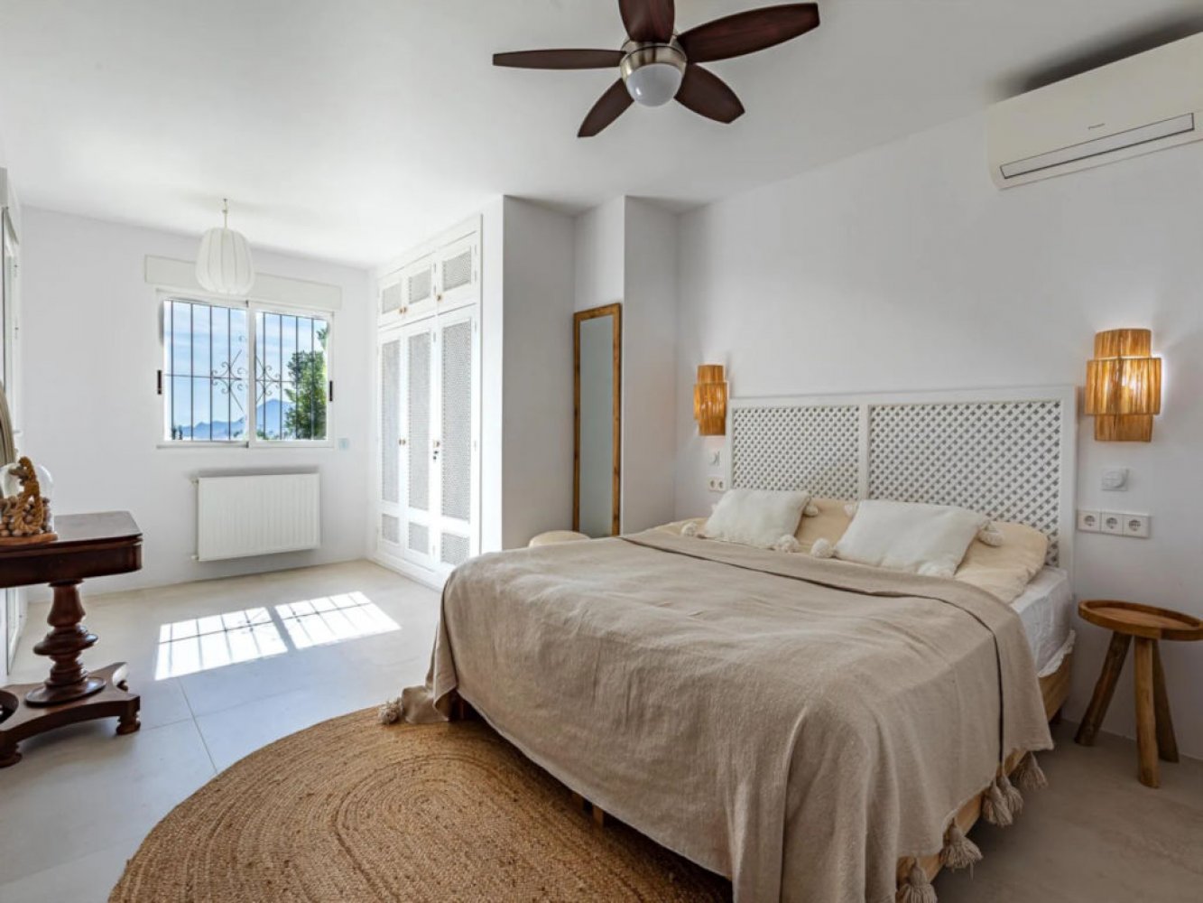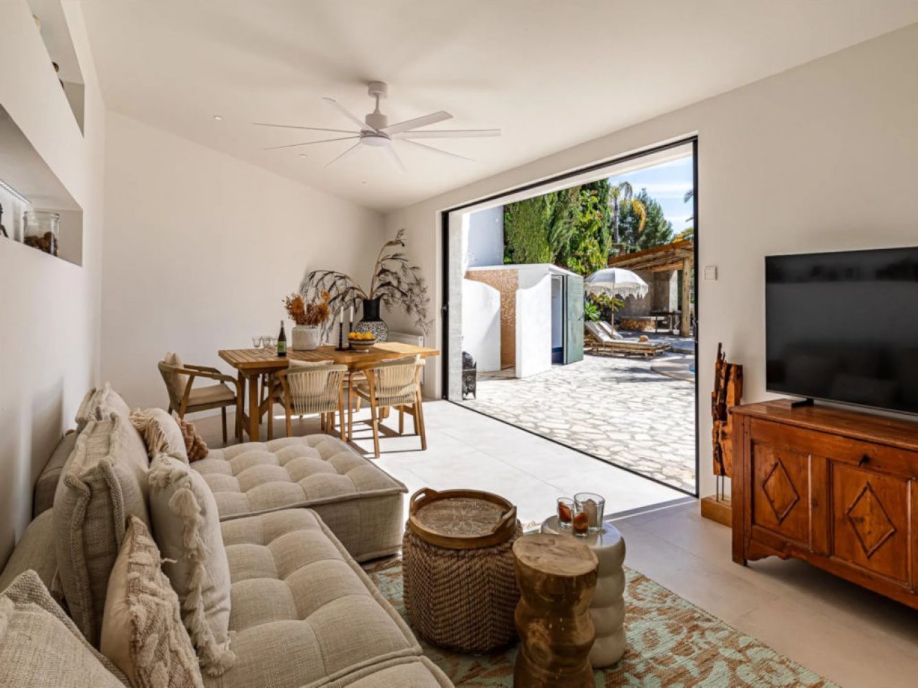 Die Villa erstreckt sich über zwei Etagen. Im Erdgeschoss befinden sich ein Wohn- und Essbereich mit TV, eine voll ausgestattete, moderne Küche mit Geschirrspüler, ein Hauswirtschaftsraum mit Waschmaschine und Trockner, drei Doppelschlafzimmer sowie zwei Badezimmer. Auf der oberen Etage gibt es einen weiteren Wohn- und Essbereich mit Kamin und TV, ein Doppelschlafzimmer, ein modernes Badezimmer sowie Zugang zu einer herrlichen Terrasse mit Panoramablick auf das Meer.