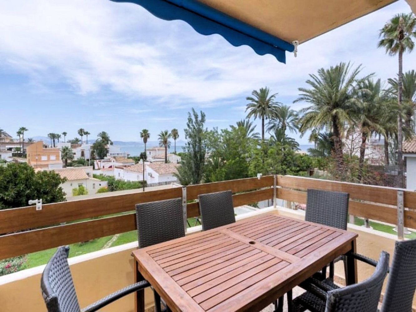 Moderne, strandnahe Ferienwohnung an der Costa Blanca bei Dénia mit Panoramablick auf das Mittelmeer. Das Apartment liegt nur 100 Meter vom Sandstrand entfernt und verfügt über einen schönen Balkon mit atemberaubendem Blick auf die mediterrane Landschaft und das Meer.