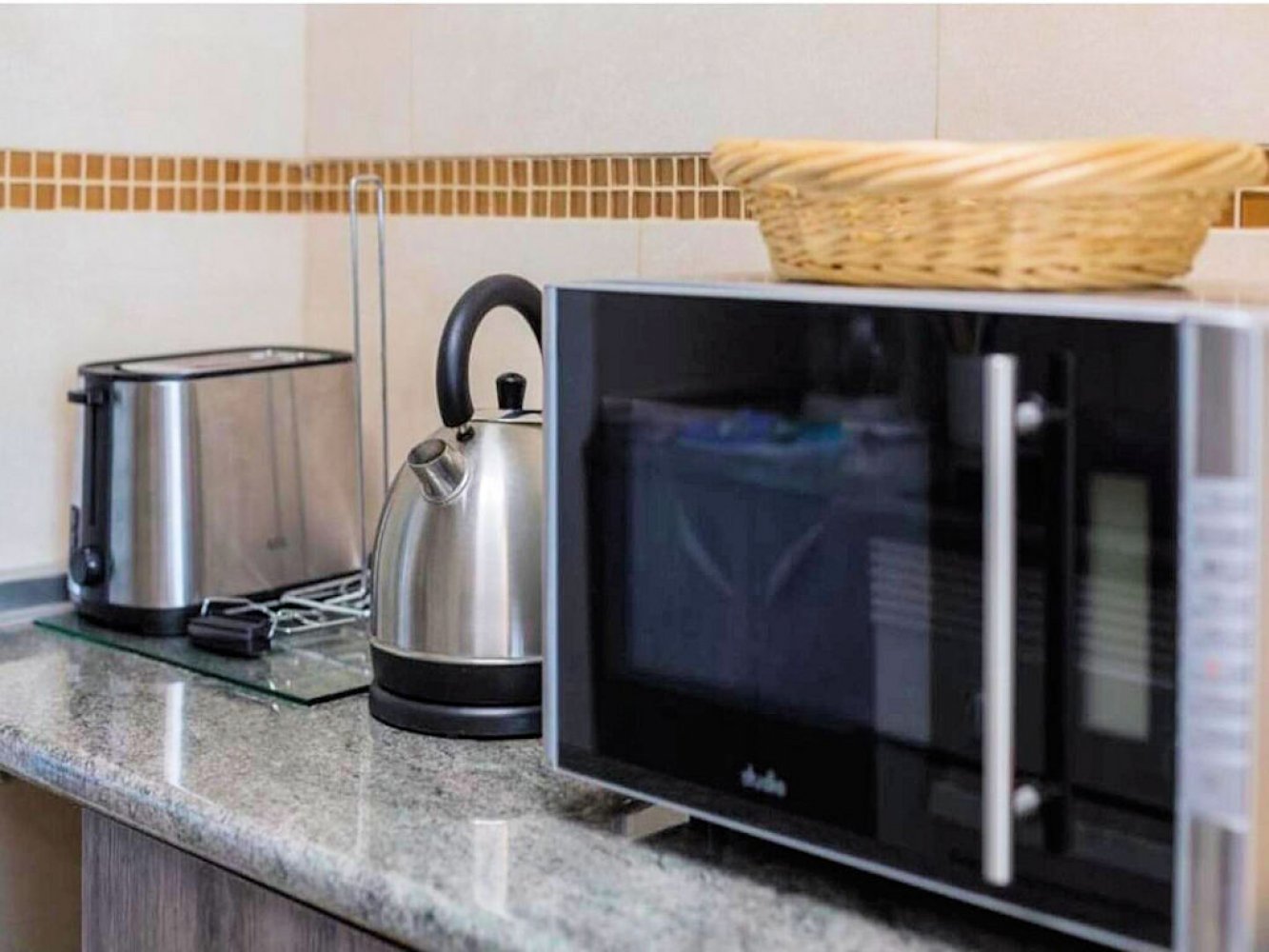 Wohn/Esszimmer, voll ausgestattete Küche(en), Herd, Kühlschrank, Gefrierfach, Toaster, Kaffeemaschine, Mikrowelle, Bügeleisen, Reinigungsset, Geschirr usw.