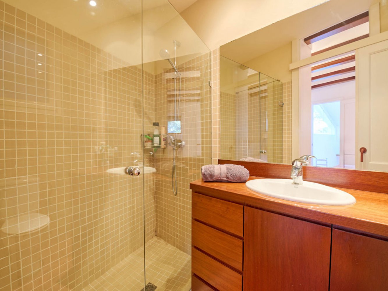 Auf dieser Ebene liegen außerdem ein Doppelschlafzimmer sowie ein modernes Badezimmer. Eine kurze Treppe mit nur drei Stufen führt ins Untergeschoss. Dort finden Sie ein Doppelzimmer, ein Einzelschlafzimmer sowie ein modernes Badezimmer. Im Obergeschoss erwarten Sie ein weiteres Doppelschlafzimmer und ein modernes Badezimmer. Das Ferienhaus liegt auf einem abgeschlossenen Grundstück und bietet ausreichend Parkmöglichkeiten direkt vor dem Haus.