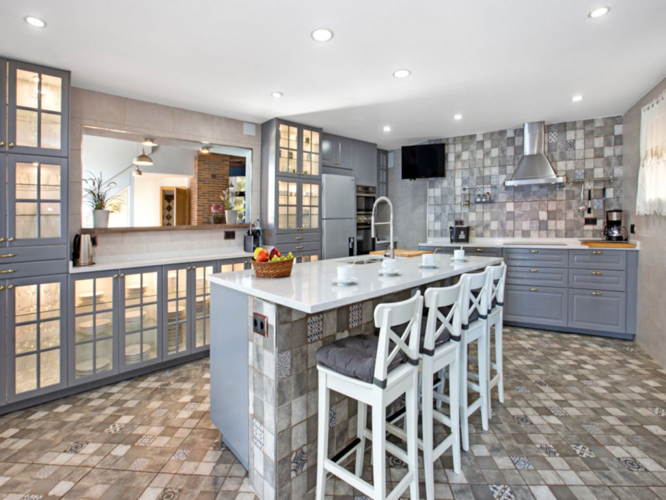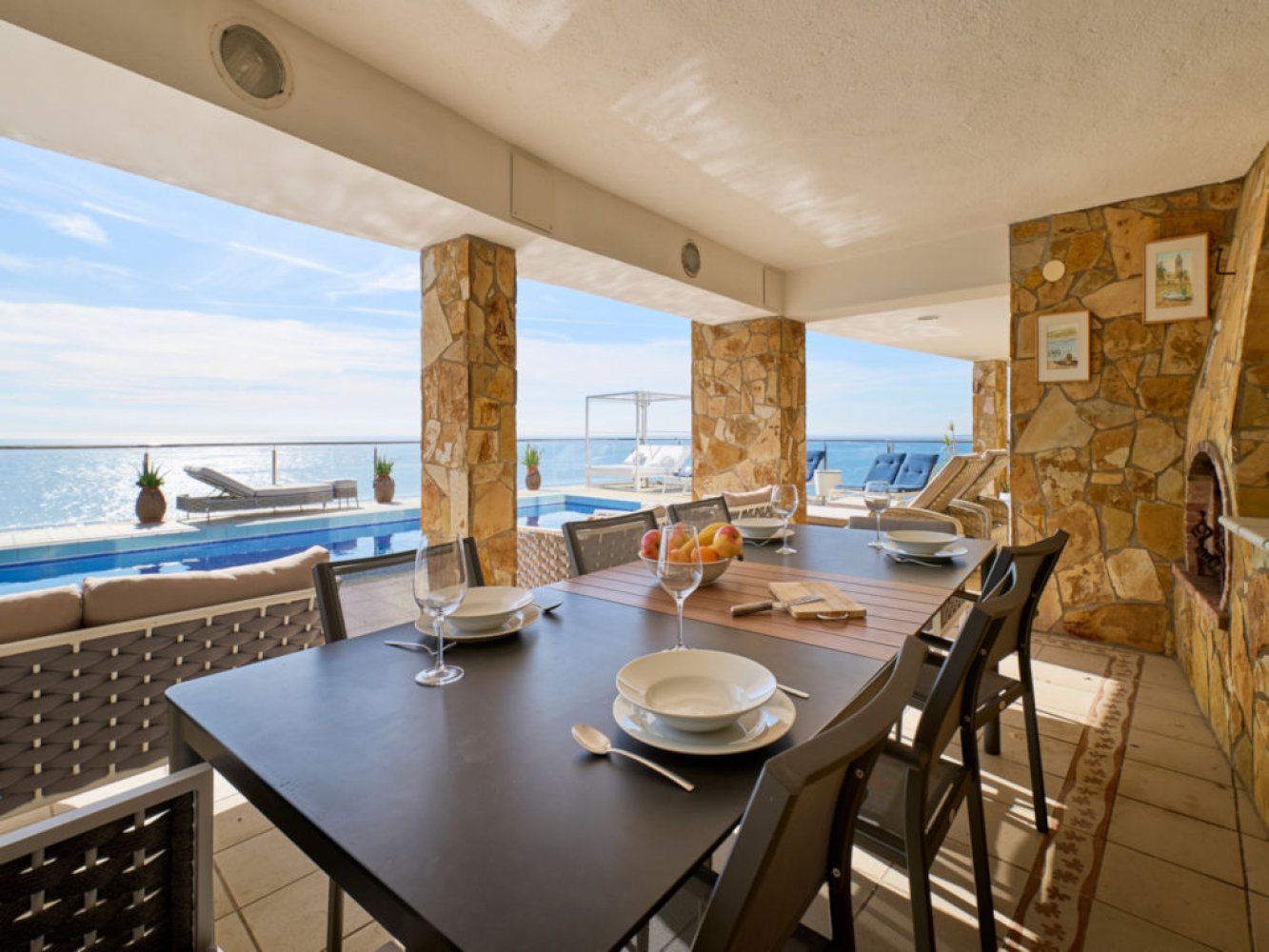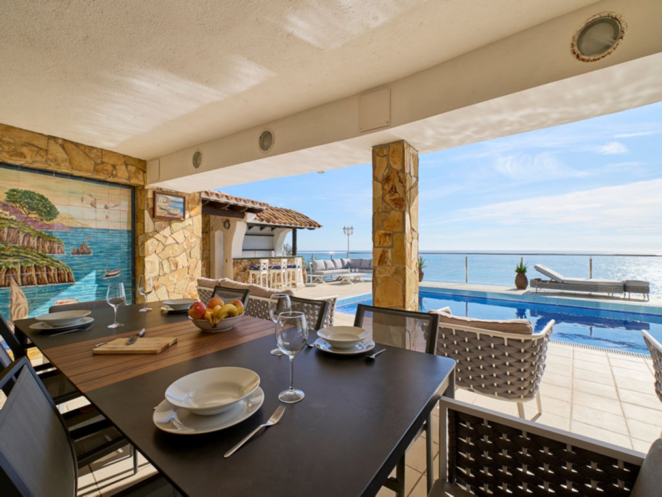 Die großzügige Villa beeindruckt mit einem lichtdurchfluteten Wohn- und Essbereich, ausgestattet mit einem Kamin und TV.  Von hier aus gelangen Sie direkt auf eine Terrasse, die Ihnen einen fantastischen Blick auf das Meer bietet. Die moderne, voll ausgestattete Küche verfügt über eine Geschirrspülmaschine und eine Waschmaschine.