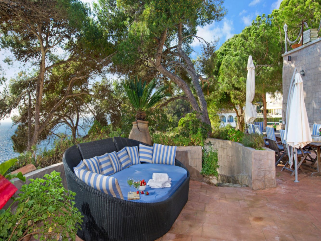 Das Highlight des beeindruckenden 7000 m² großen Anwesens ist die großzügige Sonnenterrasse mit einem 72 m² großen, privaten Schwimmbad und einer Außendusche. Verschiedene Terrassen mit gemütlichen Chill-Out-Bereichen bieten perfekte Rückzugsorte für entspannte Stunden. Die Villa verfügt über eine Außenküche mit einem gemauerten Grill. Das komplett abgeschlossene Grundstück sorgt für viel Privatsphäre und ausreichend Parkmöglichkeiten stehen zur Verfügung.