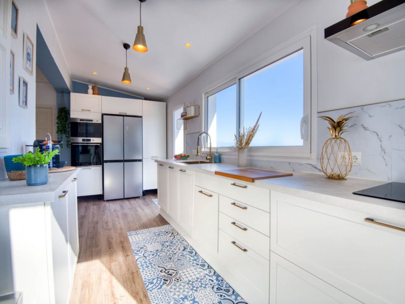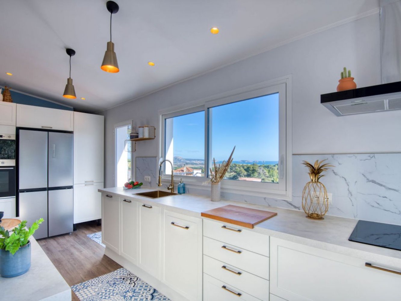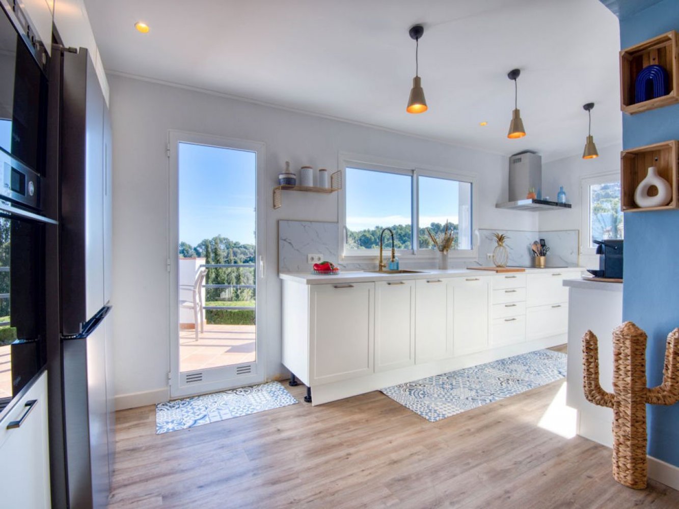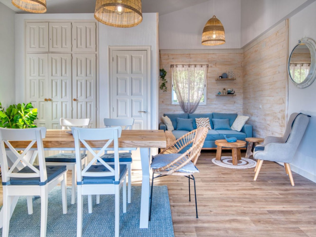 Die Villa erstreckt sich über zwei Etagen. Im oberen Bereich des Hauses finden Sie ein lichtdurchflutetes Wohn- und Esszimmer mit Kamin, Fernseher und Doppelschlafcouch, sowie eine moderne, vollständig ausgestattete Küche mit Geschirrspülmaschine und Waschmaschine. Zudem stehen ein Doppelschlafzimmer, ein Schlafzimmer für drei Personen und ein modernes Badezimmer zur Verfügung.