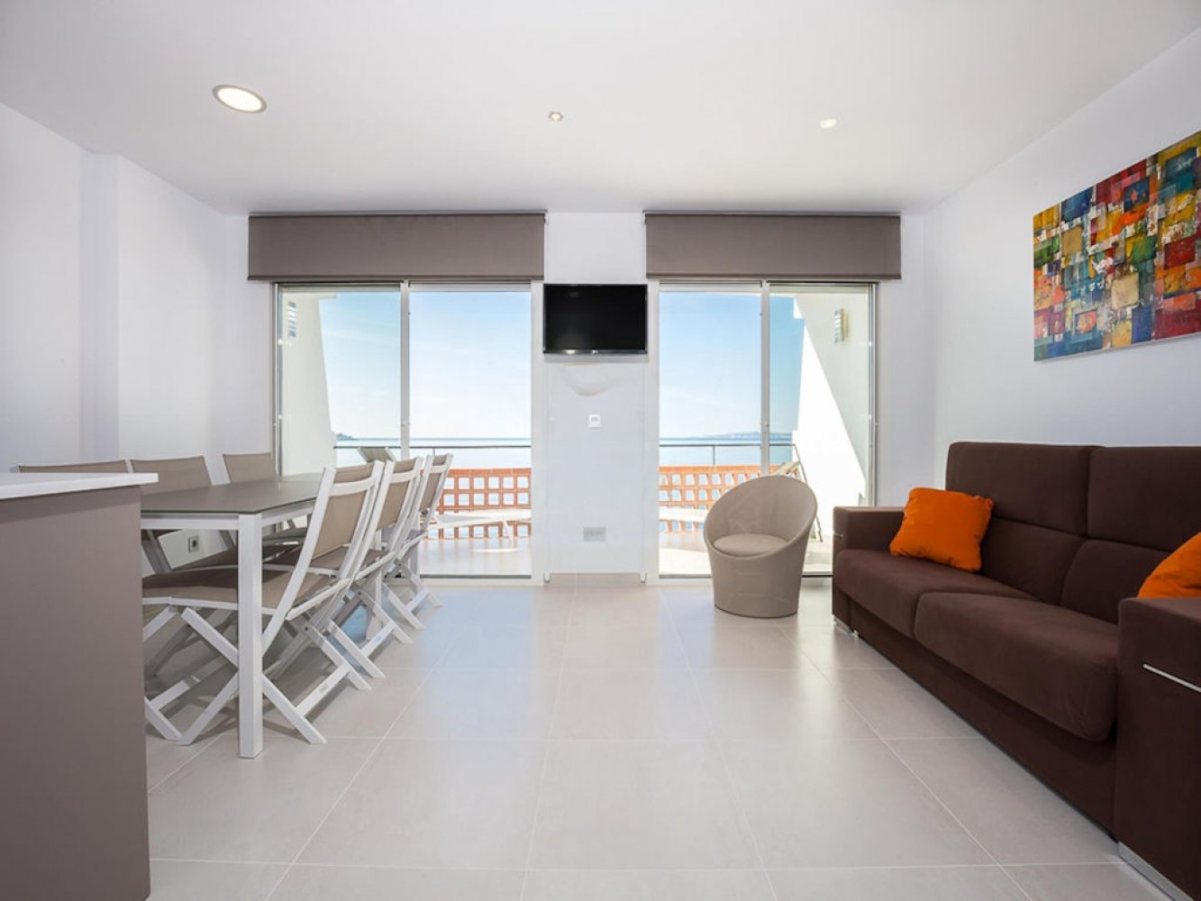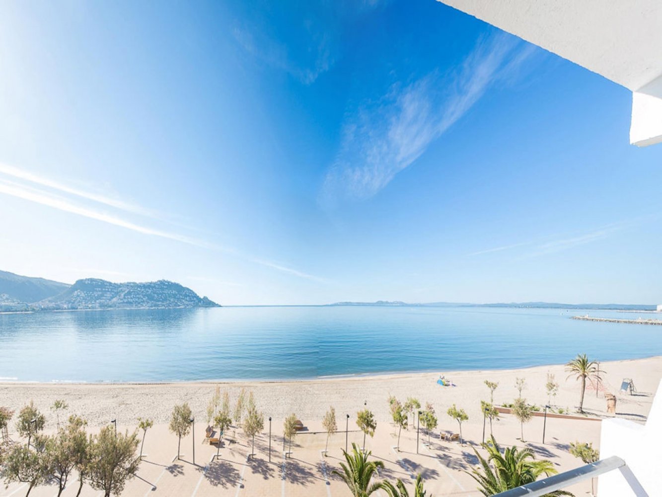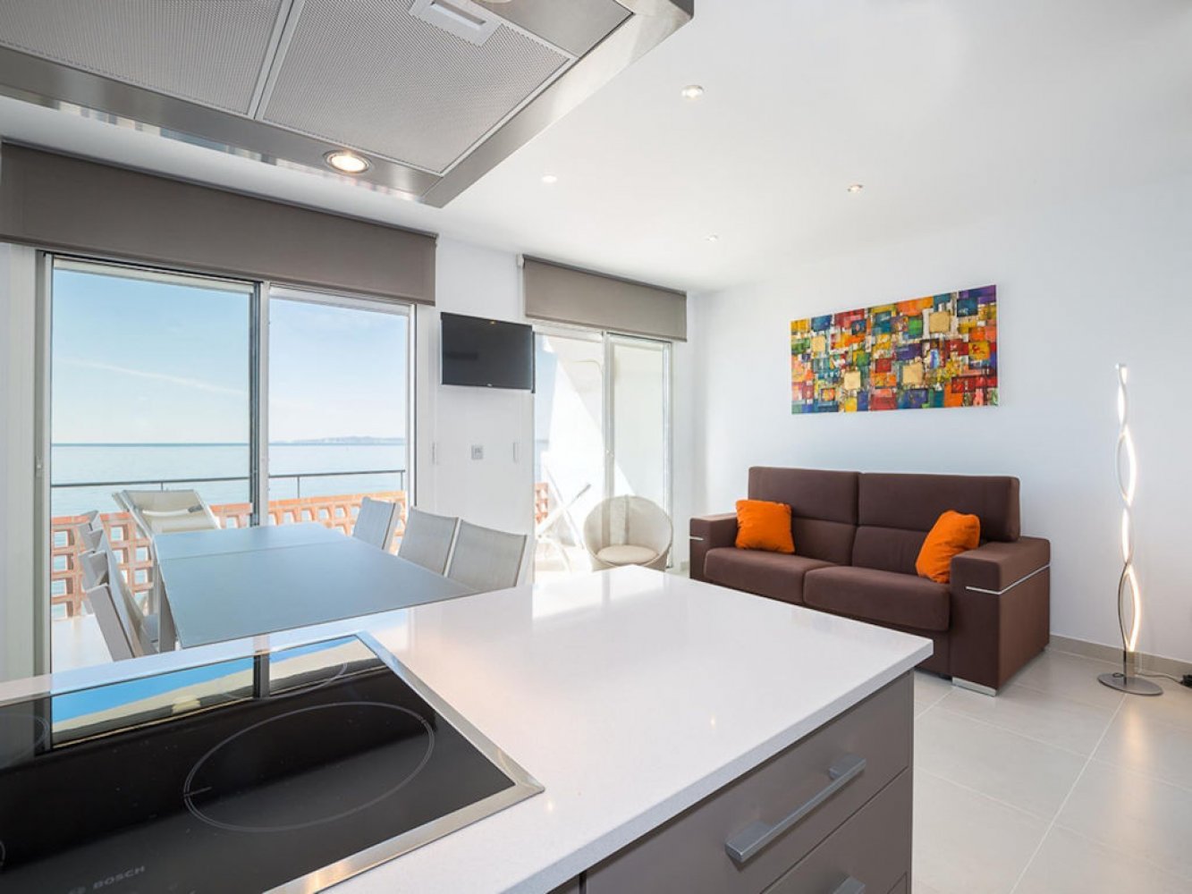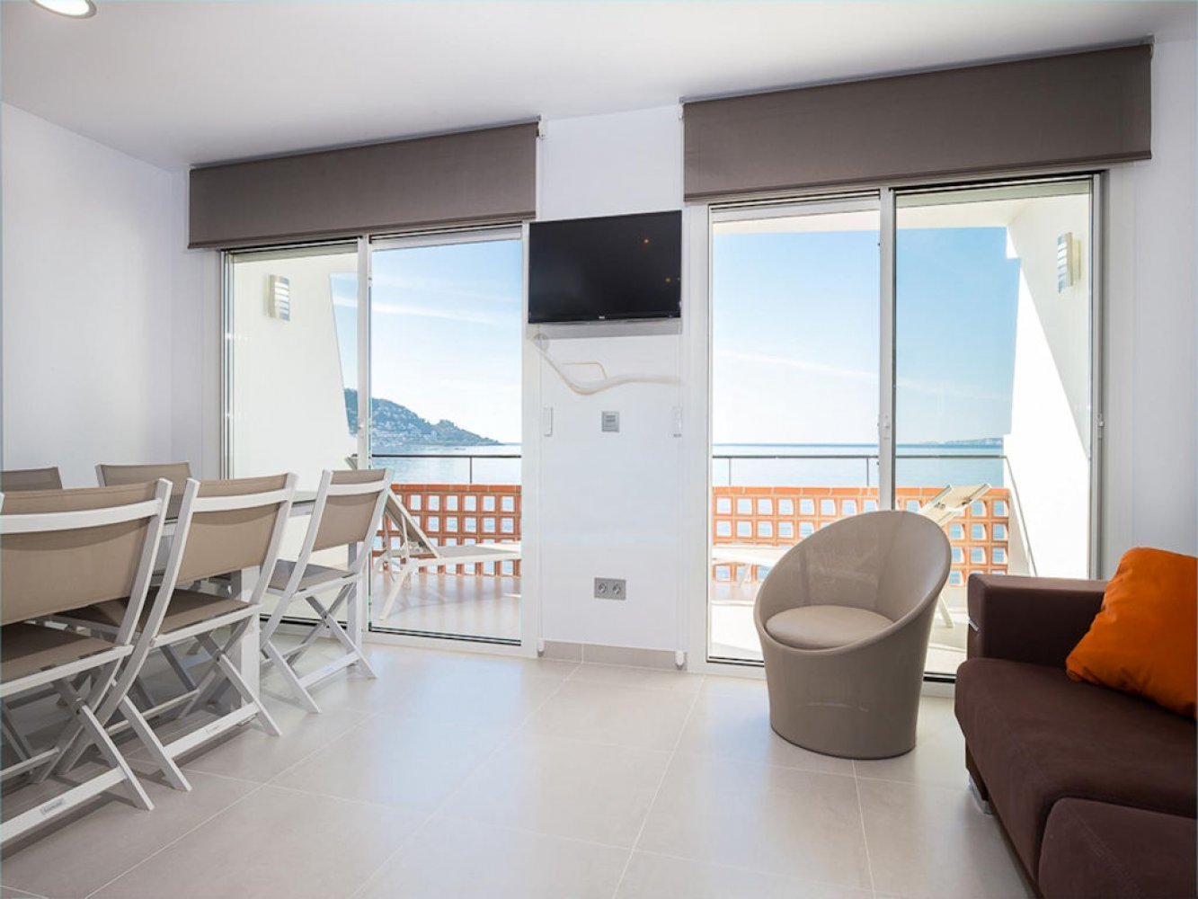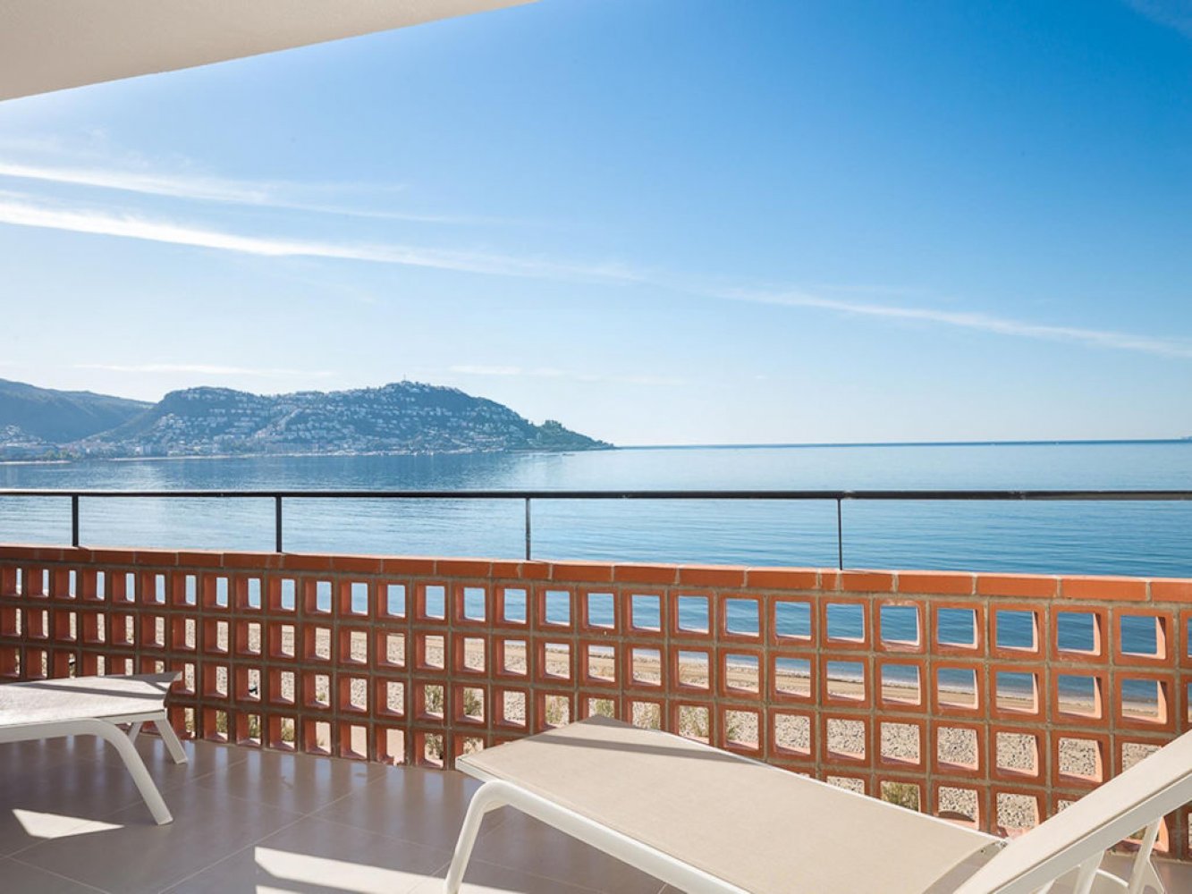 Moderne, renovierte Ferienwohnung in erster Strandreihe an der Costa Brava mit einem fantastischen Panoramablick über die Bucht von Rosas und das Mittelmeer. Das Appartement liegt direkt am Badestrand „Salatar“ sowie an der langen Strandpromenade des Ferienortes Rosas.
