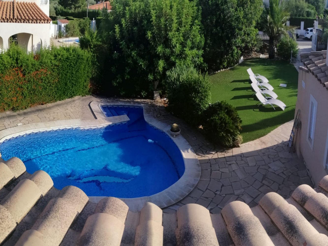 Die Villa erstreckt sich über zwei Etagen. Im Erdgeschoss finden Sie ein lichtdurchflutetes Wohn- und Esszimmer mit einem Kamin und Sat-TV, eine moderne Küche, vollständig ausgestattet mit einer Geschirrspülmaschine und ein praktischer Abstellraum mit Waschmaschine. Ebenfalls im Erdgeschoss befinden sich zwei Doppelzimmer und zwei moderne Badezimmer. Vom Wohn - Essbereich haben Sie direkten Zugang zu einer schönen, überdachten Terrasse und zum Poolbereich.