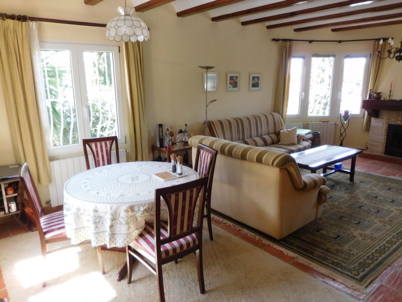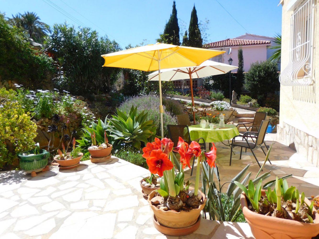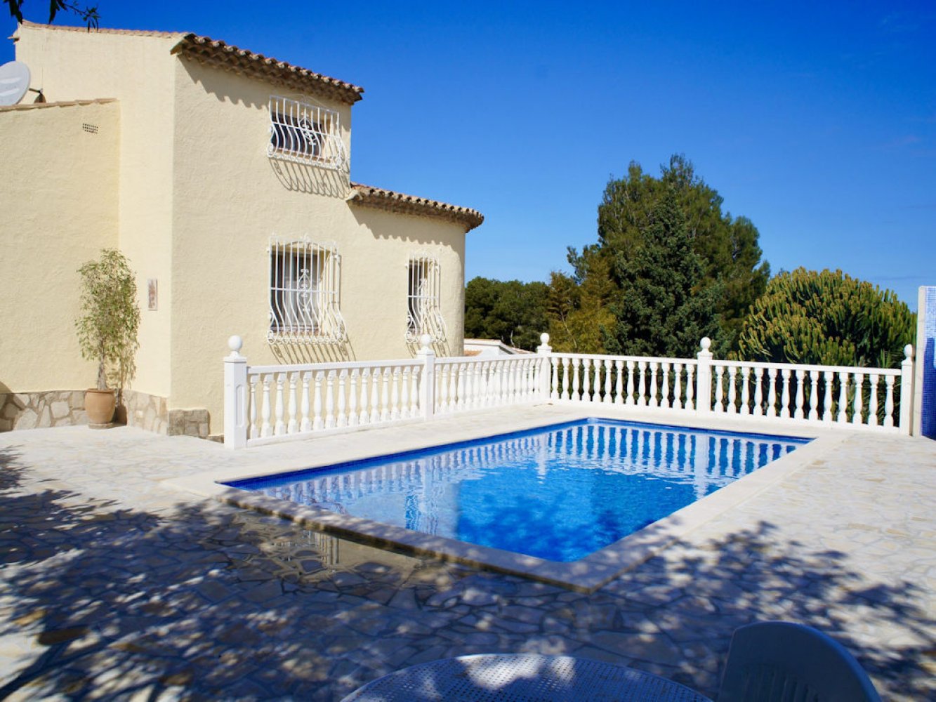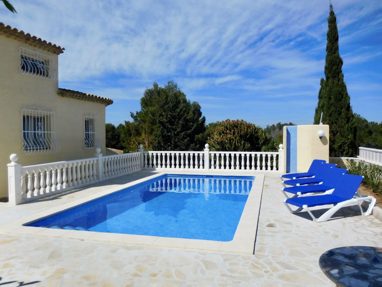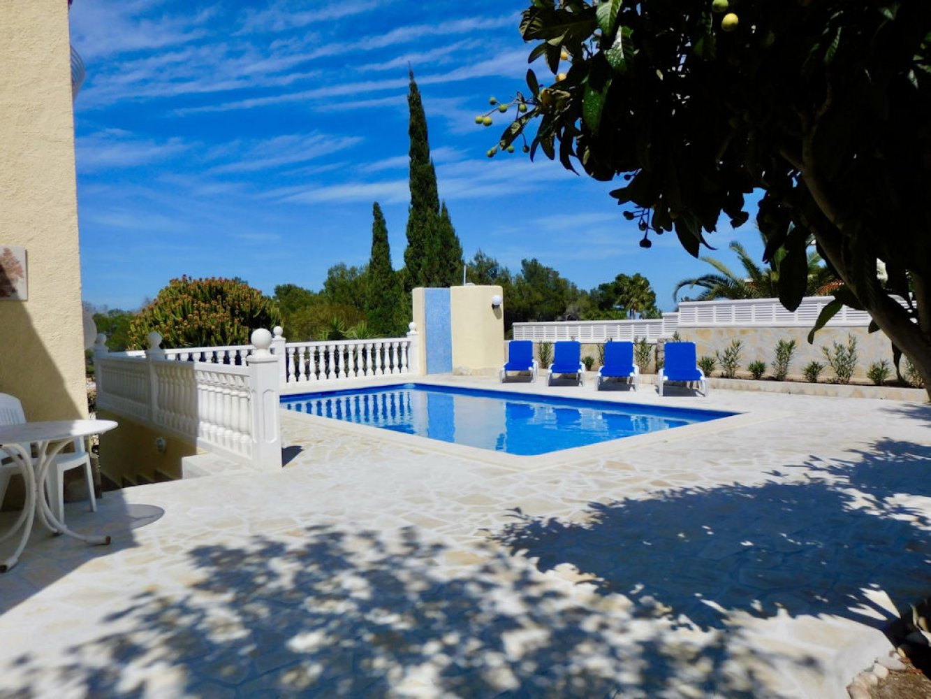Die Villa bietet einen lichtdurchfluteten Wohn- und Essbereich mit Kamin und Sat-TV sowie eine moderne, komplett ausgestattete Küche mit Geschirrspülmaschine, drei Doppelschlafzimmer und zwei Badezimmer. Vom Wohn- und Essbereich des Ferienhauses gelangen Sie auf eine schöne überdachte und verglaste Terrasse sowie in den Poolbereich. Das abgeschlossene Grundstück des Anwesens bietet viel Privatsphäre und umfasst mehrere schöne Terrassen, eine großzügige Sonnenterrasse mit Außendusche sowie einen großen, privaten Swimmingpool. Eine Garage mit Waschmaschine und Parkplätze sind vorhanden.
