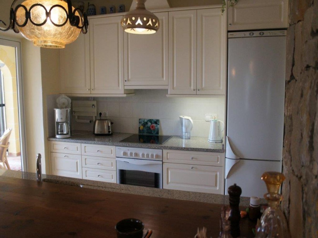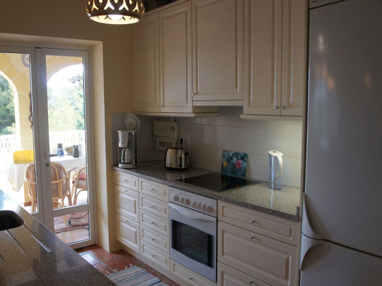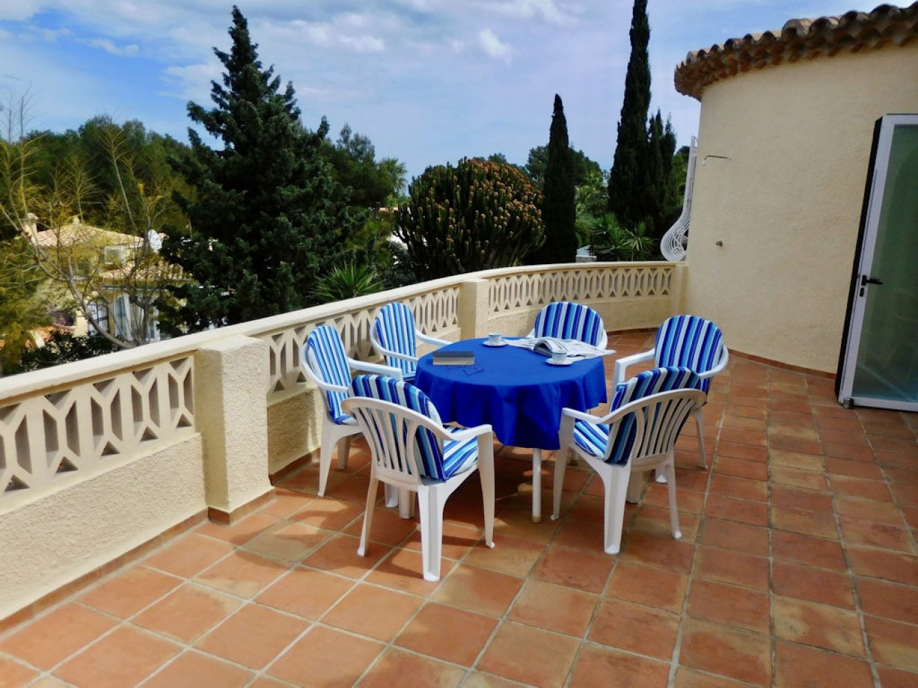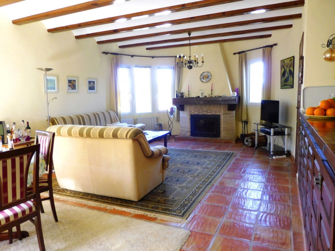 Die Villa bietet einen lichtdurchfluteten Wohn- und Essbereich mit Kamin und Sat-TV sowie eine moderne, komplett ausgestattete Küche mit Geschirrspülmaschine, drei Doppelschlafzimmer und zwei Badezimmer. Vom Wohn- und Essbereich des Ferienhauses gelangen Sie auf eine schöne überdachte und verglaste Terrasse sowie in den Poolbereich. Das abgeschlossene Grundstück des Anwesens bietet viel Privatsphäre und umfasst mehrere schöne Terrassen, eine großzügige Sonnenterrasse mit Außendusche sowie einen großen, privaten Swimmingpool. Eine Garage mit Waschmaschine und Parkplätze sind vorhanden.