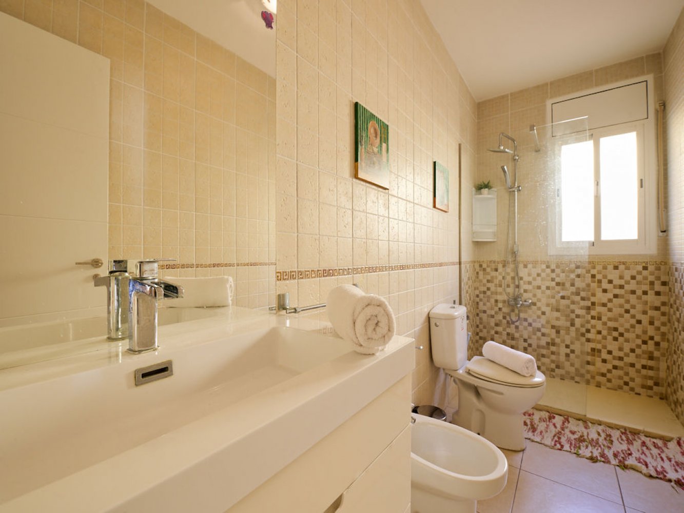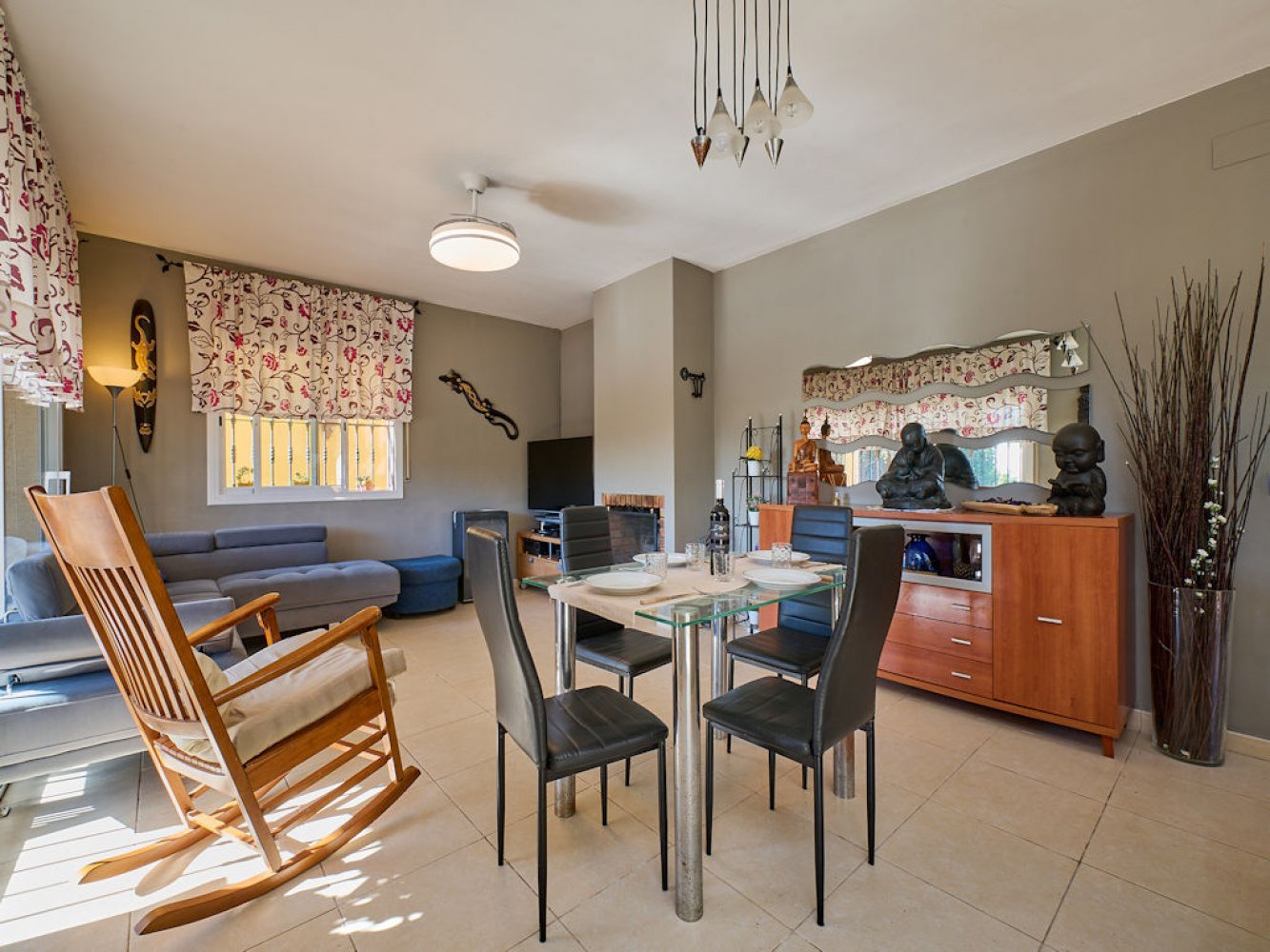 Die Ferienvilla bietet einen lichtdurchfluteten Wohn- und Essbereich mit Kamin und TV, eine moderne, komplett ausgestattete Küche mit Geschirrspüler, drei Doppelzimmer sowie zwei moderne Badezimmer. Vom Wohn- und Essbereich gelangen Sie direkt auf eine schöne, überdachte Terrasse, die einen herrlichen Blick auf die mediterrane Umgebung bietet. Auf dem abgeschlossenen Anwesen befindet sich eine große Sonnenterrasse mit gemauertem Grill sowie ein großes privates Schwimmbad.
