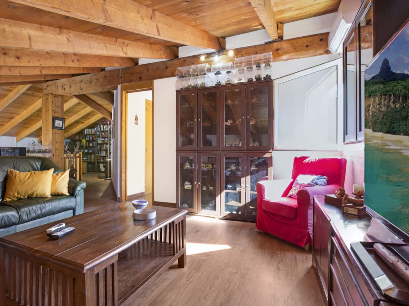 The villa spans two floors. On the lower level, you will find a bright living and dining area with fireplace and TV, a modern fully equipped kitchen with dishwasher and washing machine, three double bedrooms, and two modern bathrooms. From the living and dining area, you can step out onto a lovely covered balcony with impressive views of the Mediterranean surroundings. Upstairs, on the mezzanine, there is another spacious double bedroom with a library and TV.