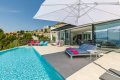 The villa spans two floors. The light-filled living and dining area is equipped with a TV and offers spectacular views of the sparkling Mediterranean through its large panoramic windows. The fully equipped, modern kitchen features a dishwasher, and a laundry room with a washing machine is located next to it. The holiday home has five air-conditioned double bedrooms, five modern bathrooms, and a separate guest WC. Several tastefully designed terraces are available. From the living and dining area, you can directly access the spacious pool terrace with stunning sea views.