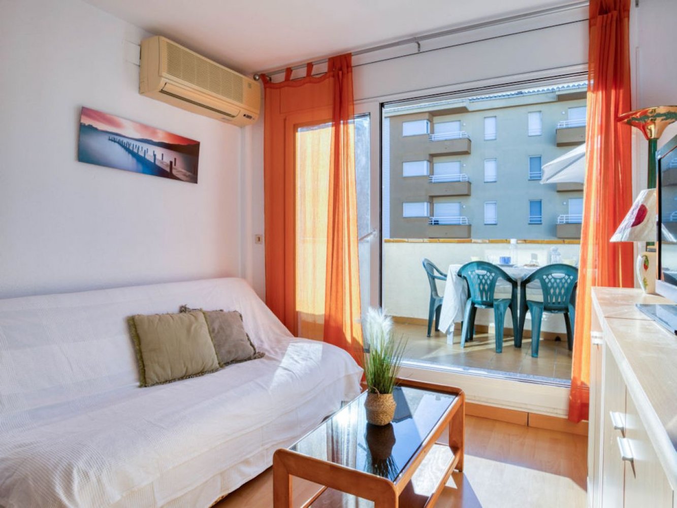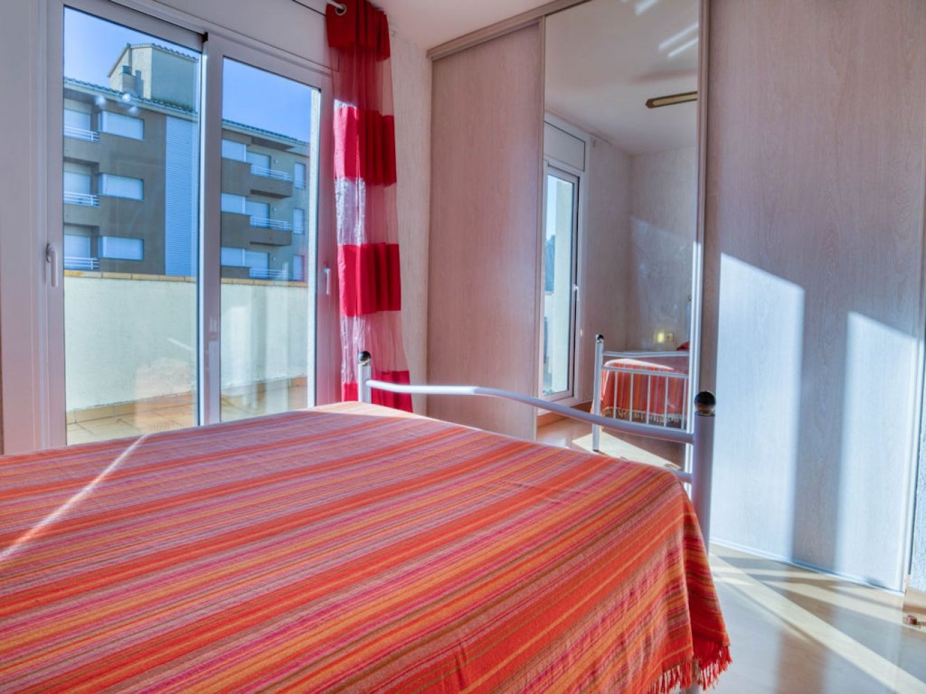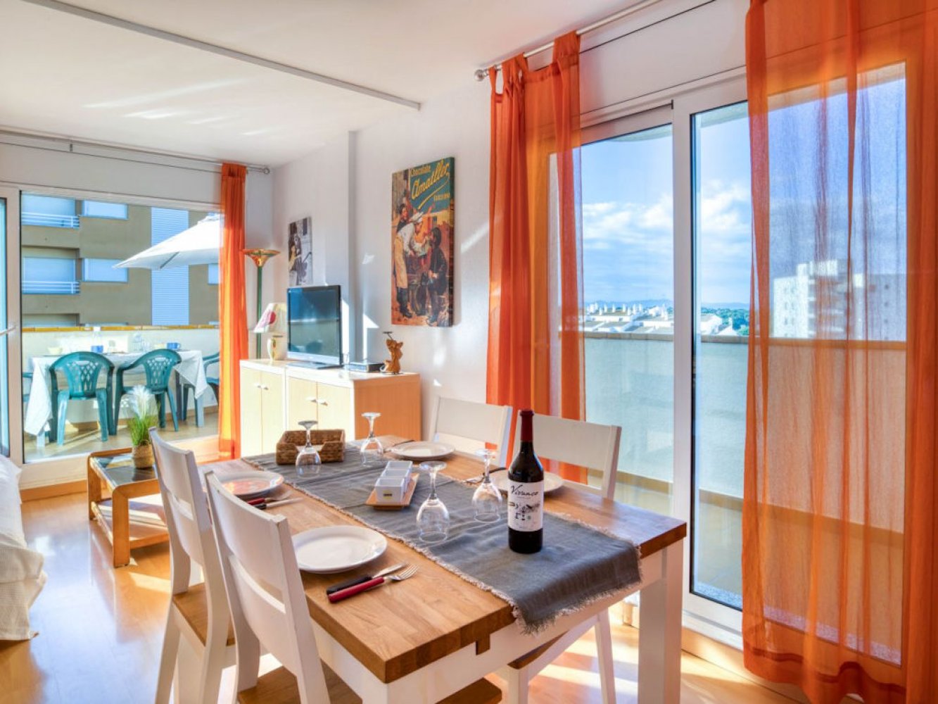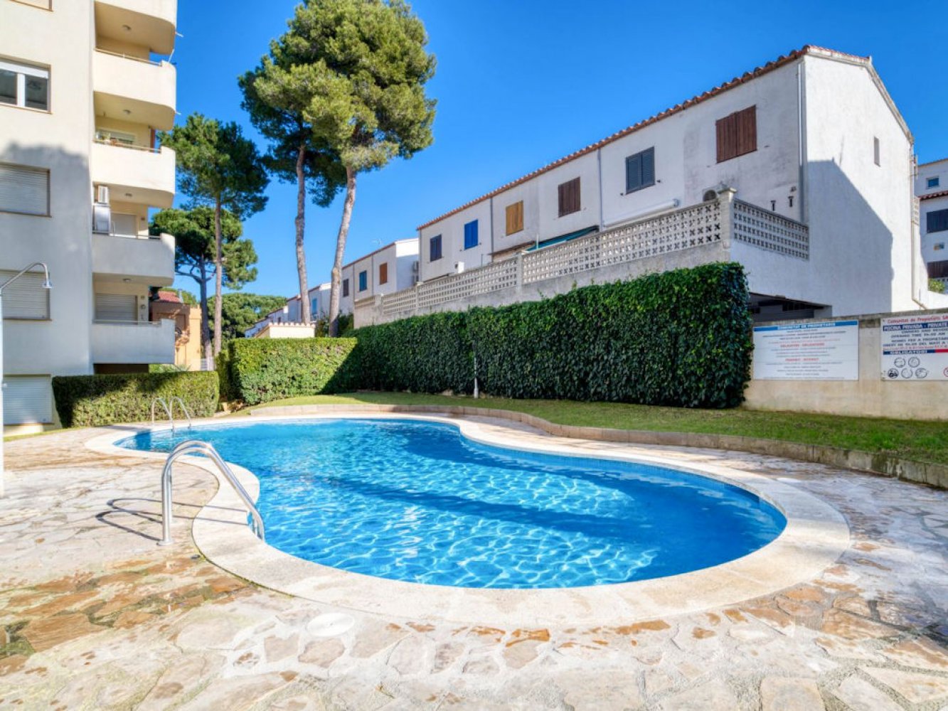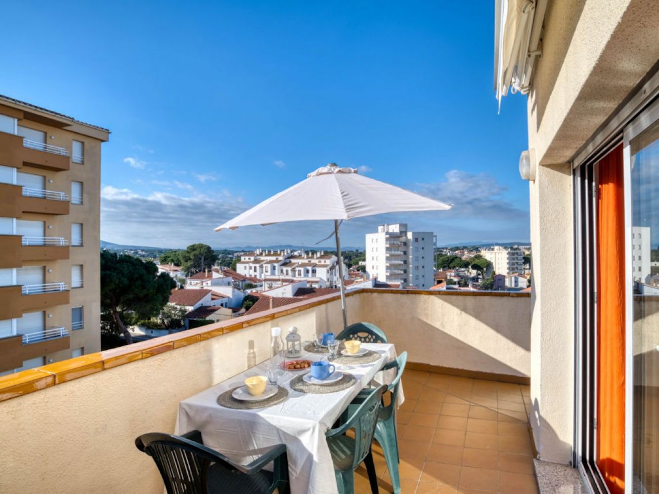 Modern holiday apartment in L'Escala on the Costa Brava, Spain. The apartment is part of a well-maintained community complex with a sunbathing lawn, outdoor showers, and a swimming pool.