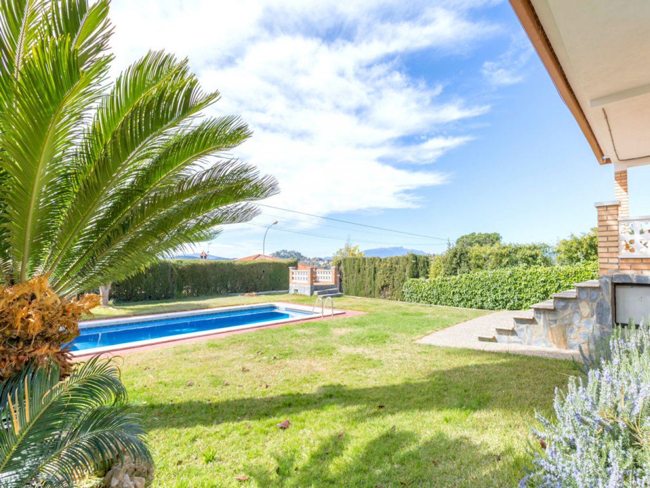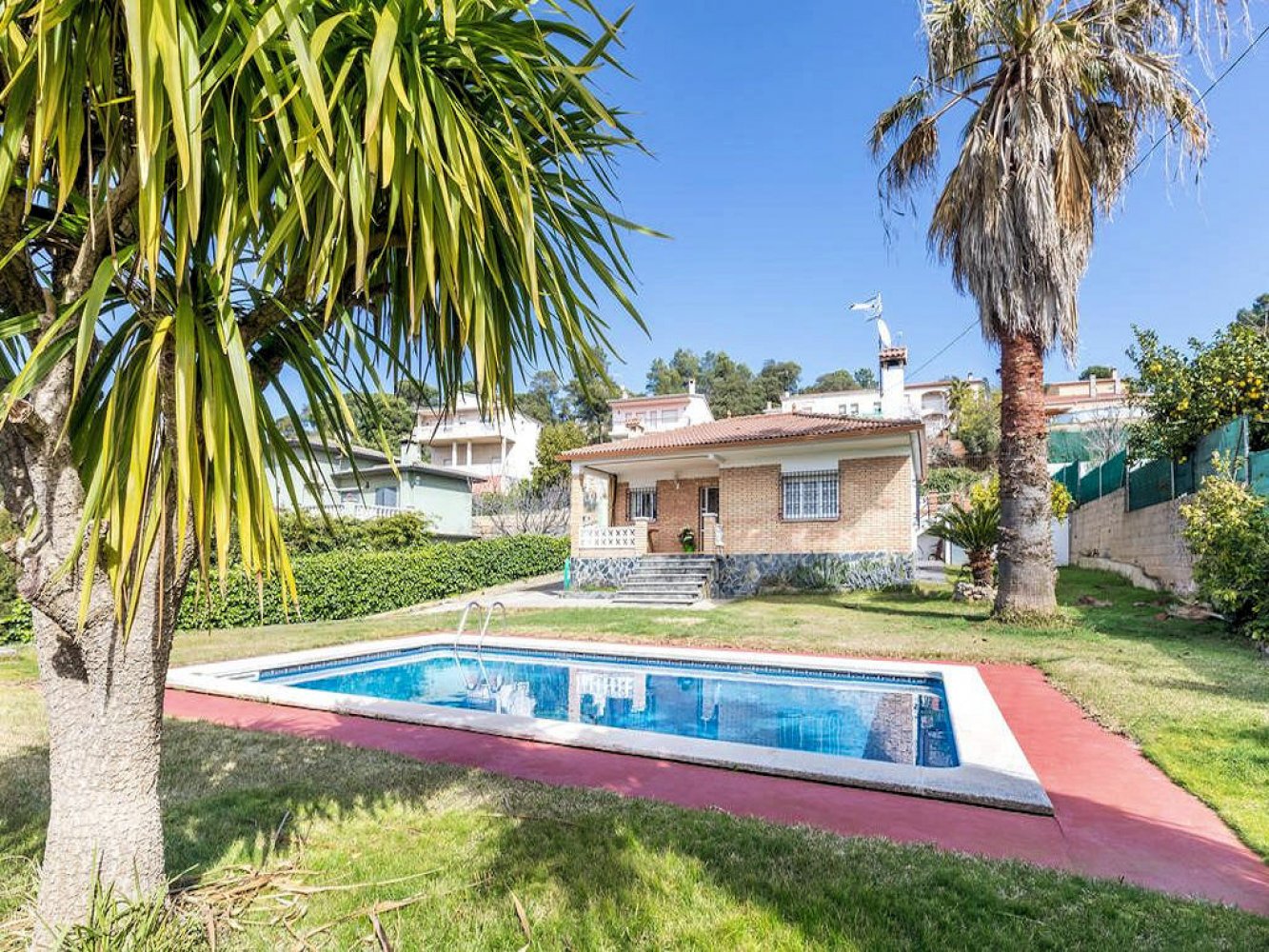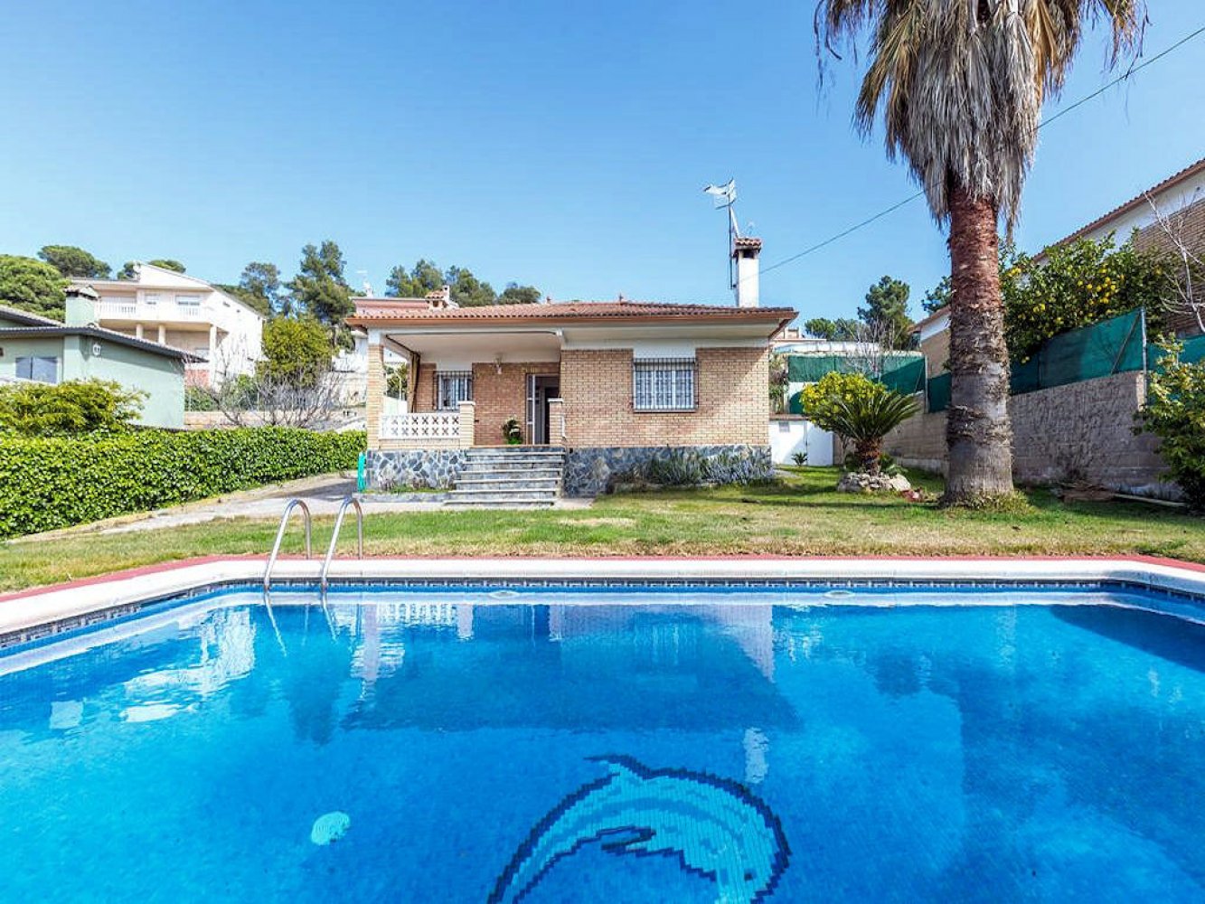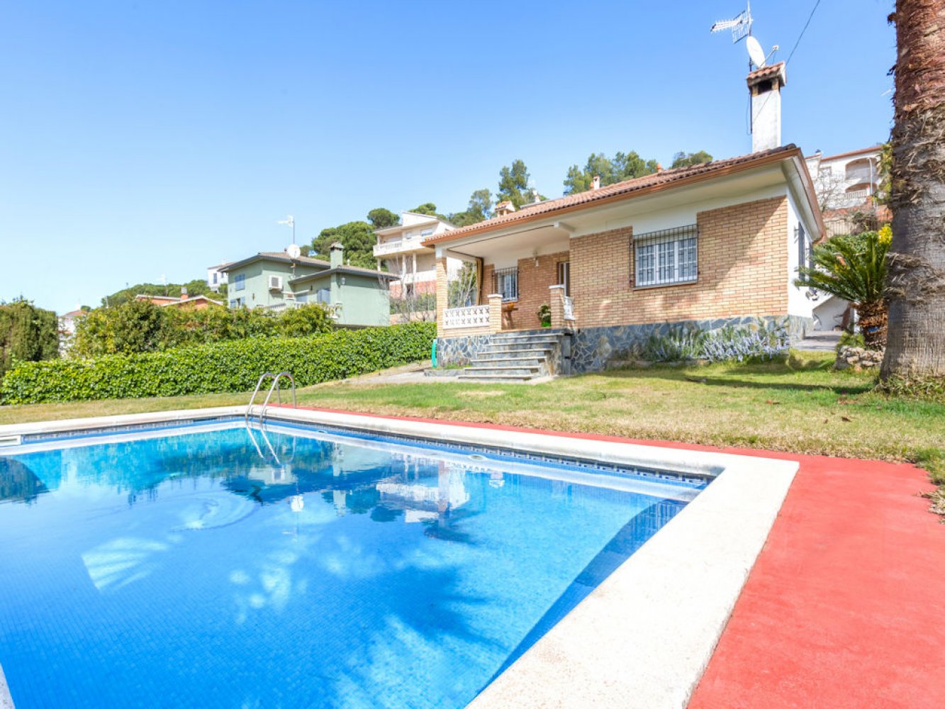 The house has a light-flooded living and dining room with fireplace and TV, a modern kitchen equipped with dishwasher and washing machine, three double bedrooms and two modern bathrooms. From the living-dining area you have direct access to a beautiful covered terrace, the spacious lawn and the large swimming pool. The property is completely enclosed and there is parking for two vehicles on the estate.