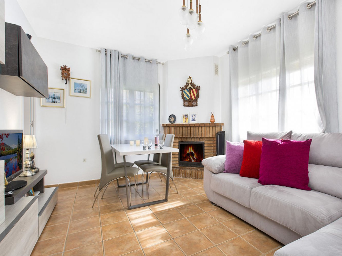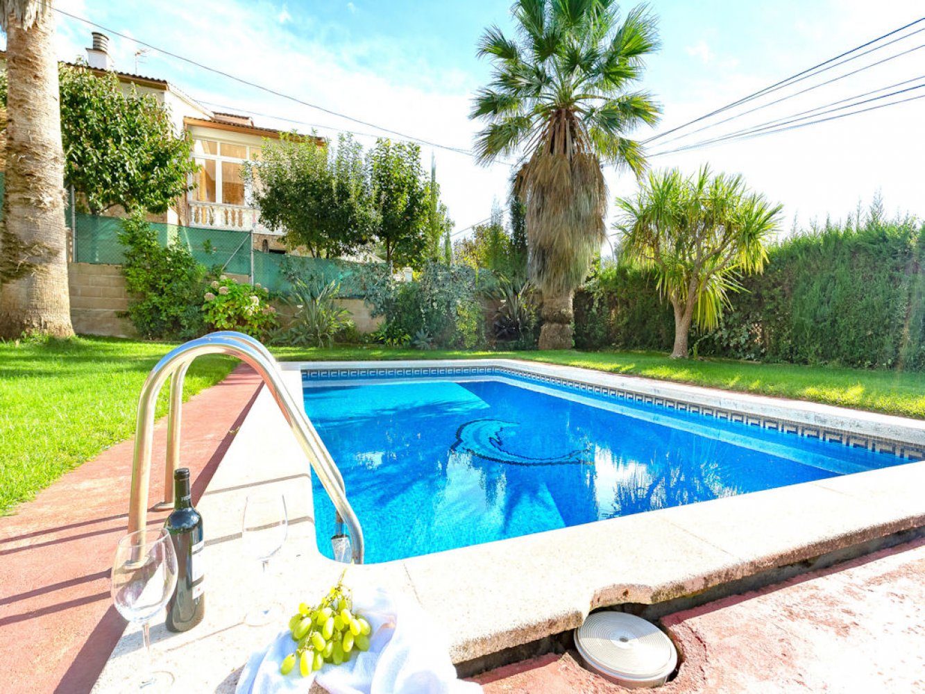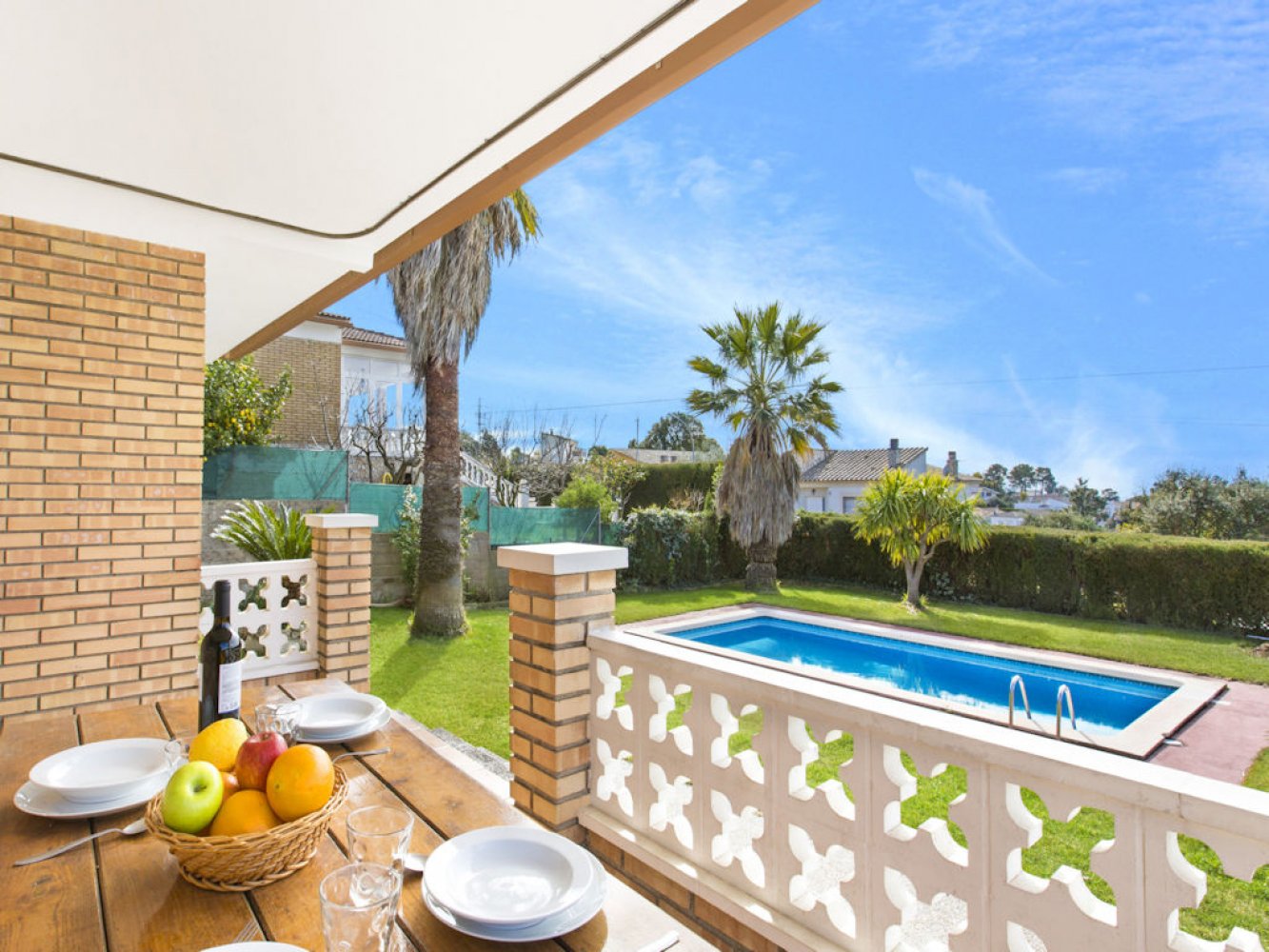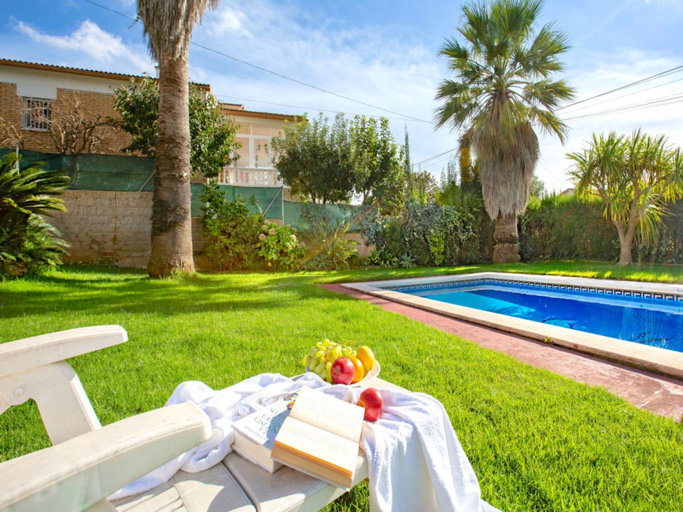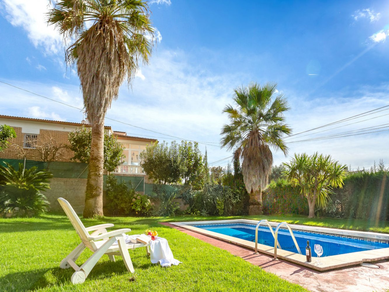 The house has a light-flooded living and dining room with fireplace and TV, a modern kitchen equipped with dishwasher and washing machine, three double bedrooms and two modern bathrooms. From the living-dining area you have direct access to a beautiful covered terrace, the spacious lawn and the large swimming pool. The property is completely enclosed and there is parking for two vehicles on the estate.