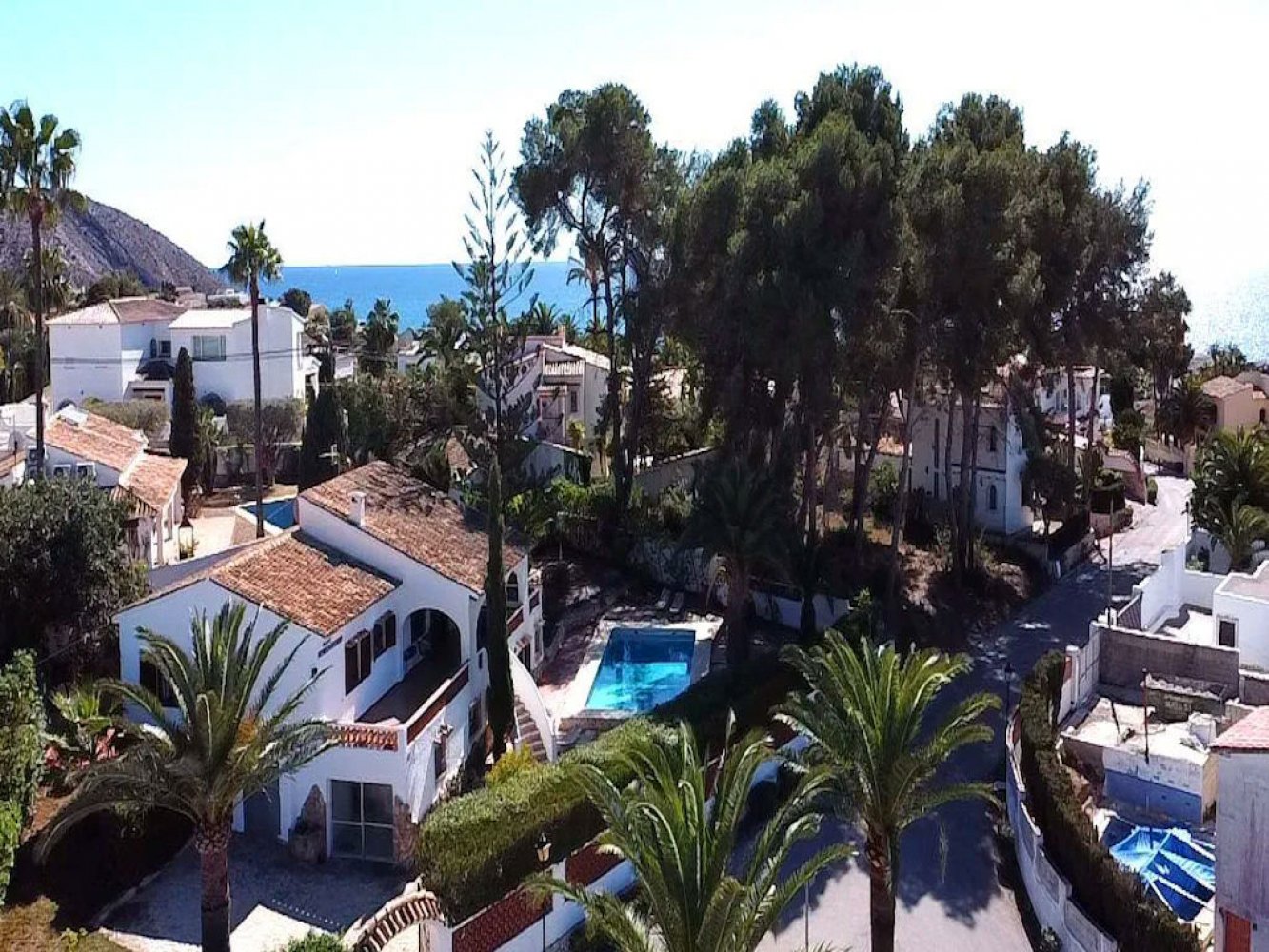 Villa mediterránea cerca de la playa en Moraira con 4 dormitorios, 3 baños, piscina privada, terrazas y vistas panorámicas – a solo 500 m de la playa de arena.