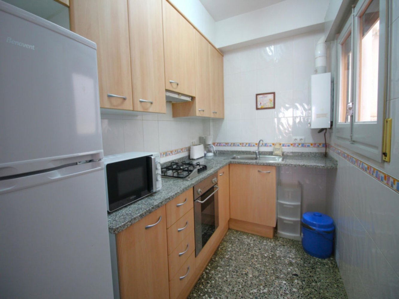 El apartamento se encuentra en la primera planta y dispone de un luminoso salón-comedor con TV, una cocina totalmente equipada con lavadora, dos dormitorios dobles, un dormitorio individual y un baño moderno. Desde el salón-comedor se accede a un balcón con vistas a la calle. Hay aparcamiento disponible alrededor del edificio.